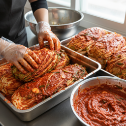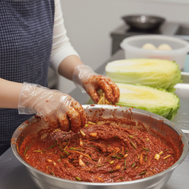 절임배추는 물기를 충분히 빼고, 잎 사이사이에 양념을 채워 넣어야 김치가 골고루 숙성됩니다. 바깥 잎으로 감싸 밀봉하듯 정리하면 저장성이 좋아집니다.